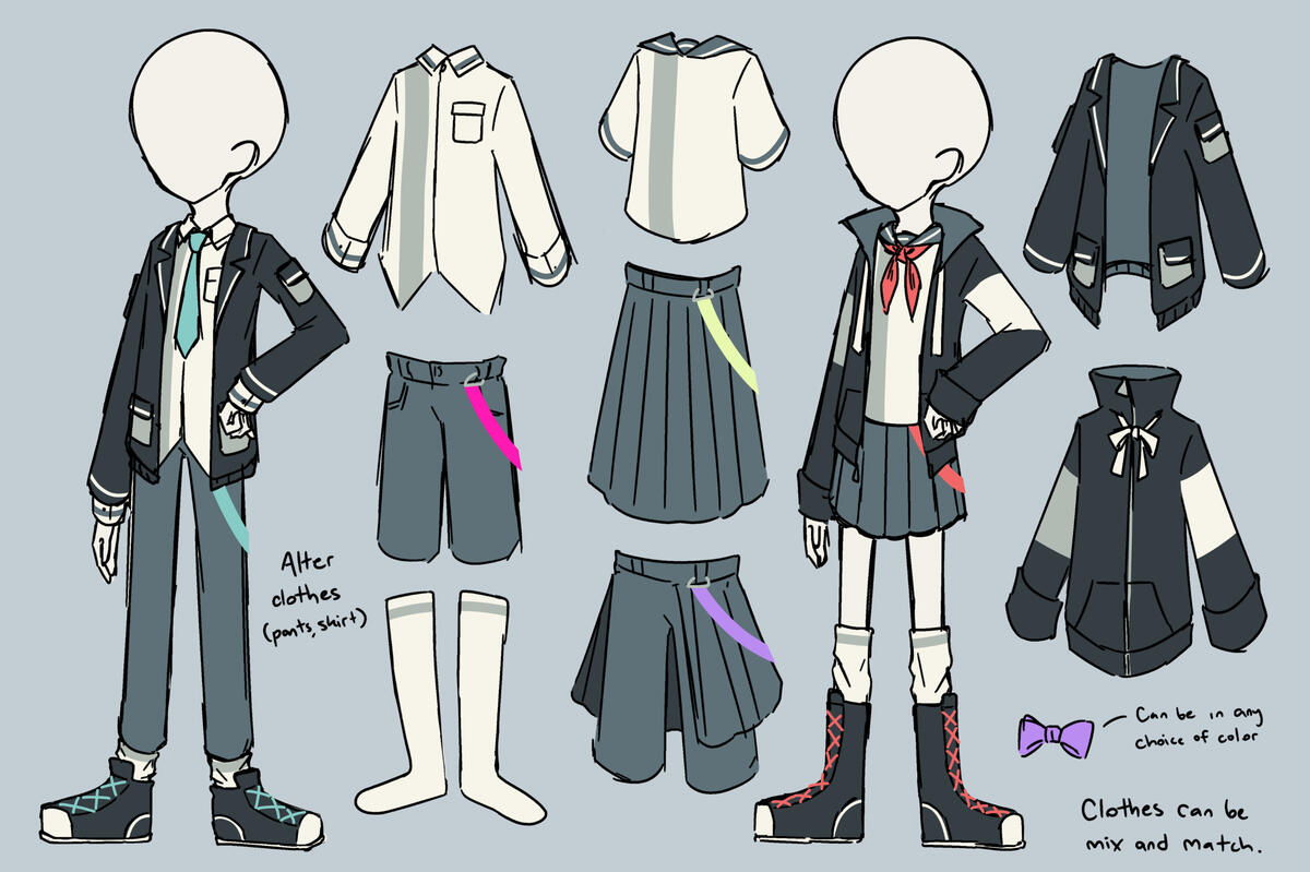 ° The height of shoes depends on the height of the bottoms. (Sneaker shoes for long pants/skirts; boots for short pants/skirts.)